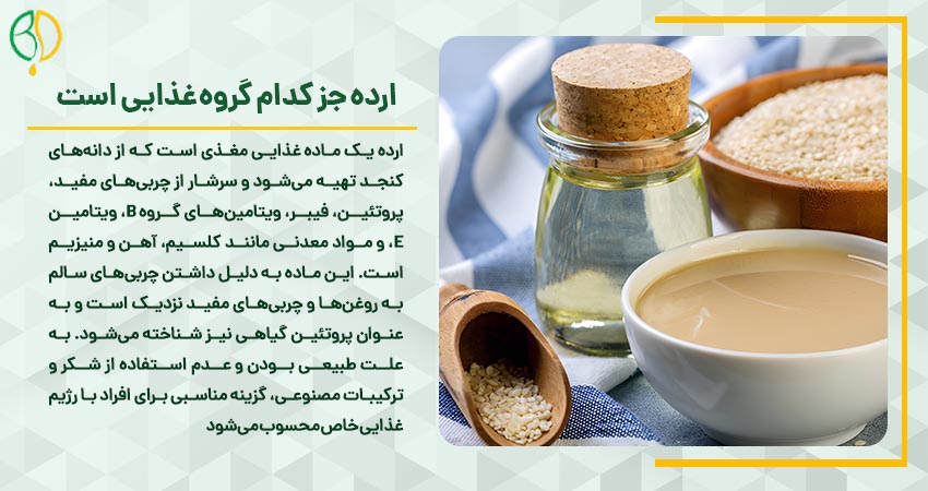 یکی از مهمترین موضوعاتی که افراد، به ویژه افرادی که رژیم غذایی خاصی را دنبال میکنند، به آن توجه دارند، نوع موادی است که در وعدههای غذایی خود از آنها استفاده میکنند. ارده در گروه مغزها و دانههای روغنی قرار میگیرد. این ماده غذایی از آسیابشدن دانههای کنجد تهیه میشود و سرشار از چربیهای مفید، پروتئین، فیبر، ویتامینهای گروه B، ویتامین E، و مواد معدنی مانند کلسیم، آهن و منیزیم است.